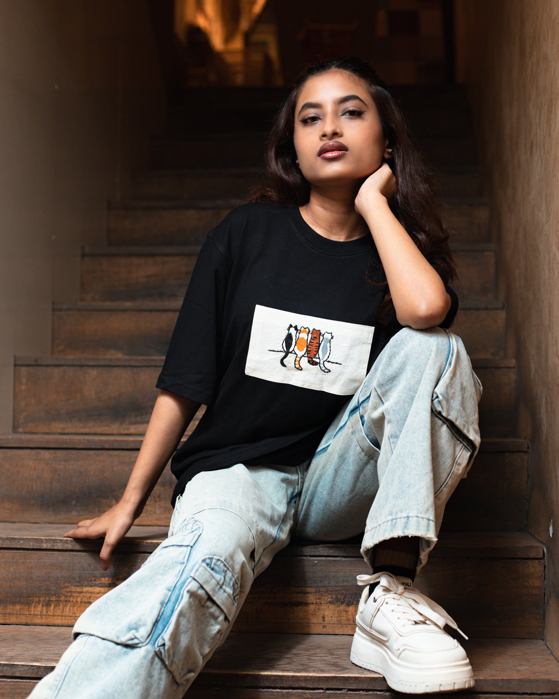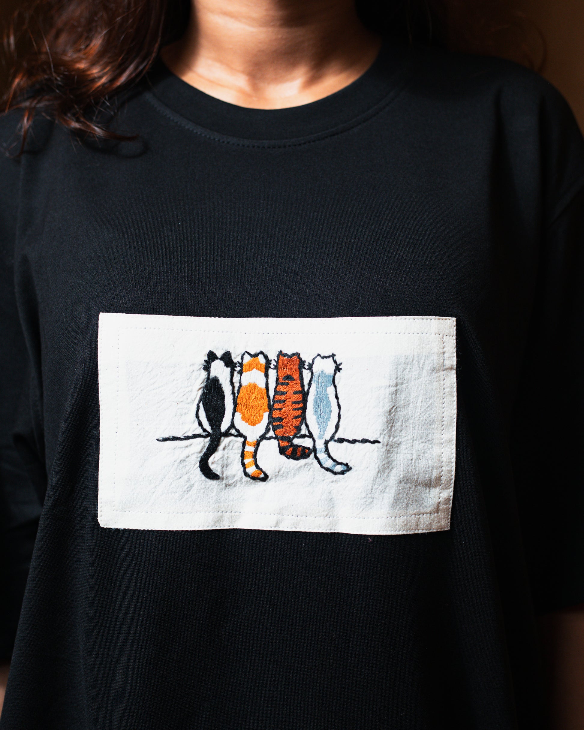 The ๐ฝ๐๐ง๐๐ก ๐พ๐ค๐ข๐ข๐ช๐ฃ๐๐ฉ๐ฎย tee captures that calm simplicity โ four cats, each different, yet together in stillness. Hand-embroidered with care, itโs a tribute to the unspoken bonds that make ordinary moments feel like home.