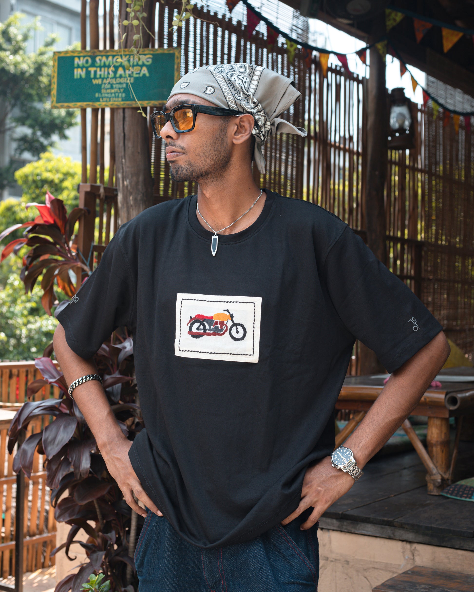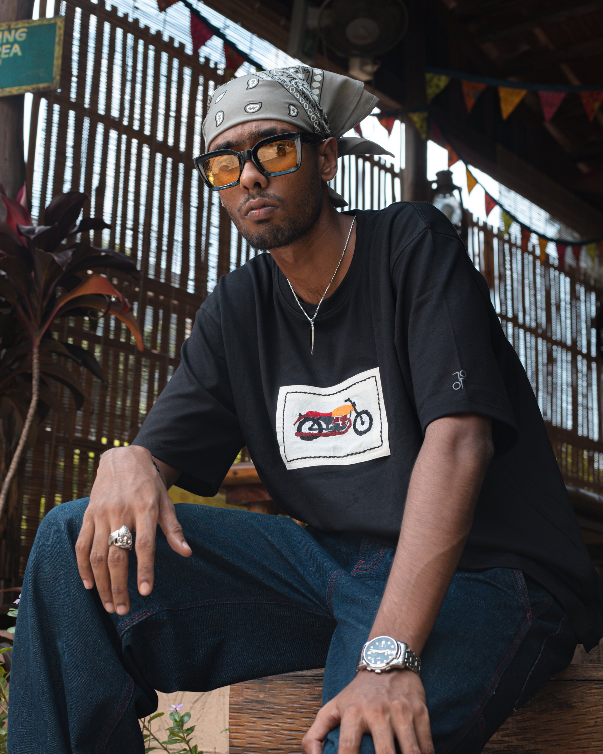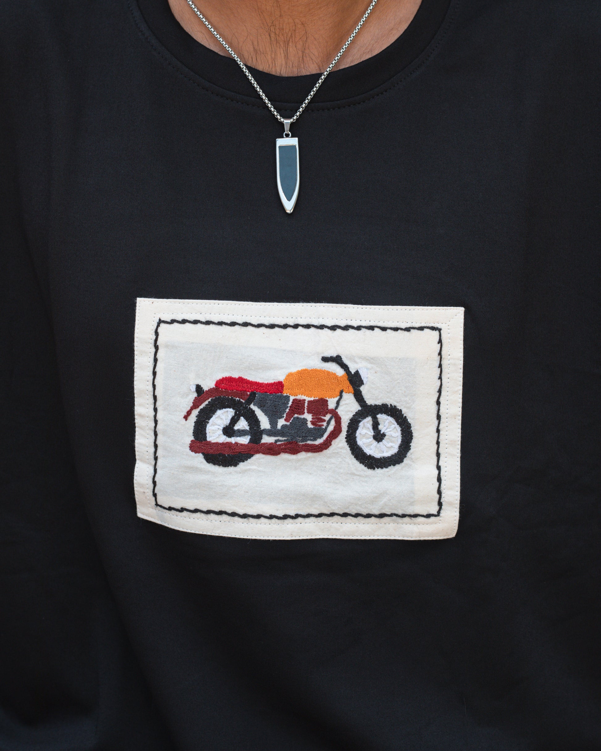 Inspired by the raw freedom of the open road, this piece pays tribute to bikers who embrace the thrill of the ride. At its heart lies a hand-embroidered cafΓ© racer motorcycle, carefully stitched by the skilled artisans of Jamalpur. Each thread captures not only the grit of the machine but also the artistry of human hands, bringing together speed and craft in perfect harmony.